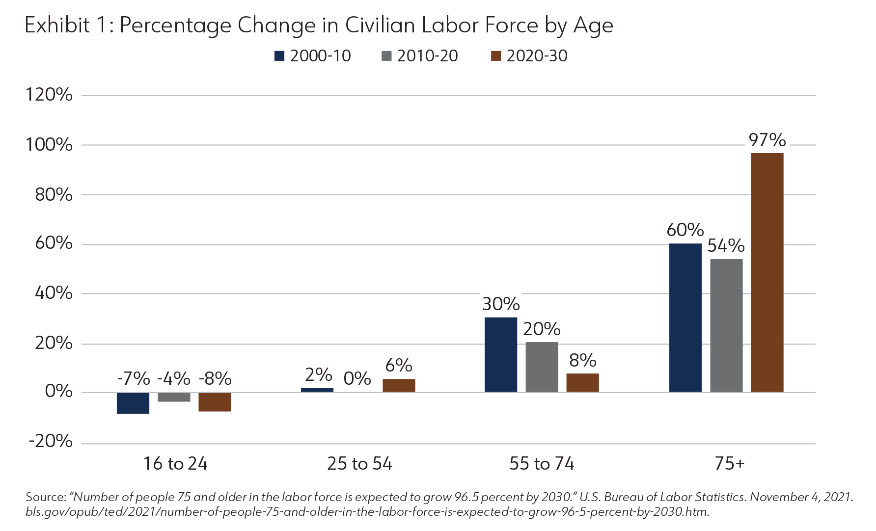 According to the U.S. Bureau of Labor Statistics, the total labor force of people ages 16 to 24 is projected to shrink by 7.5% by 2030. By the end of the decade, 9.5% of the civilian labor force is projected to be older than 65.2 Already, 20% of workers are 55 and older and approaching retirement.3