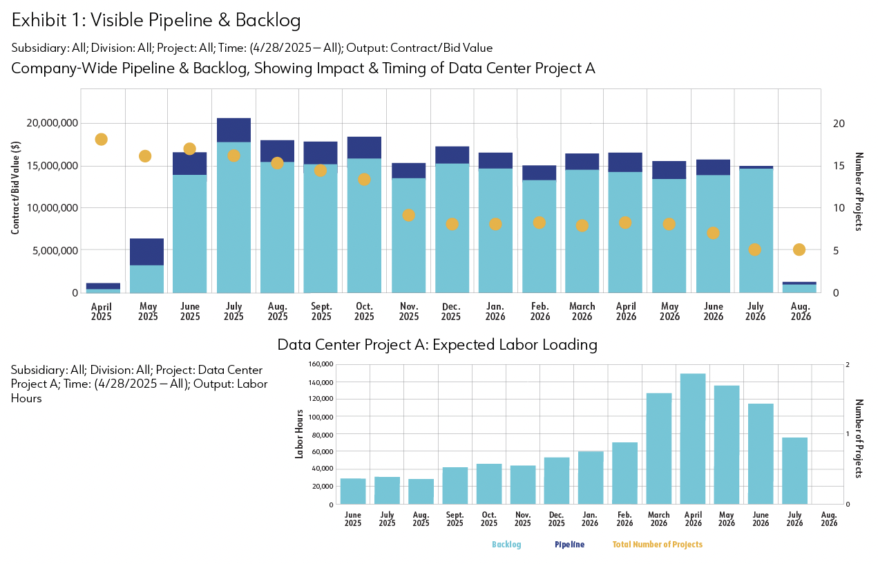 Without clear visibility into the pipeline and backlog (Exhibit 1), planning is often reactive — jeopardizing the company’s ability to deliver on time and within budget.